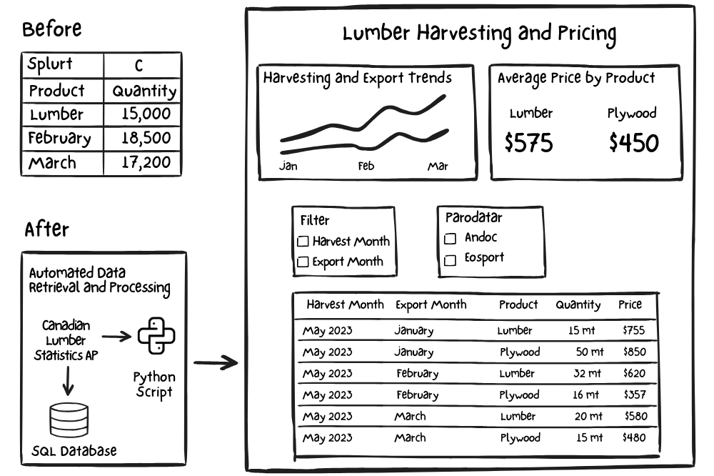 As COFI’s membership base grew and market expectations evolved, clients increasingly demanded timely and accurate data regarding forest product exports, lumber harvesting activities, and market pricing. This data needed to be accessible in real-time and presented through interactive dashboards that support decision-making.